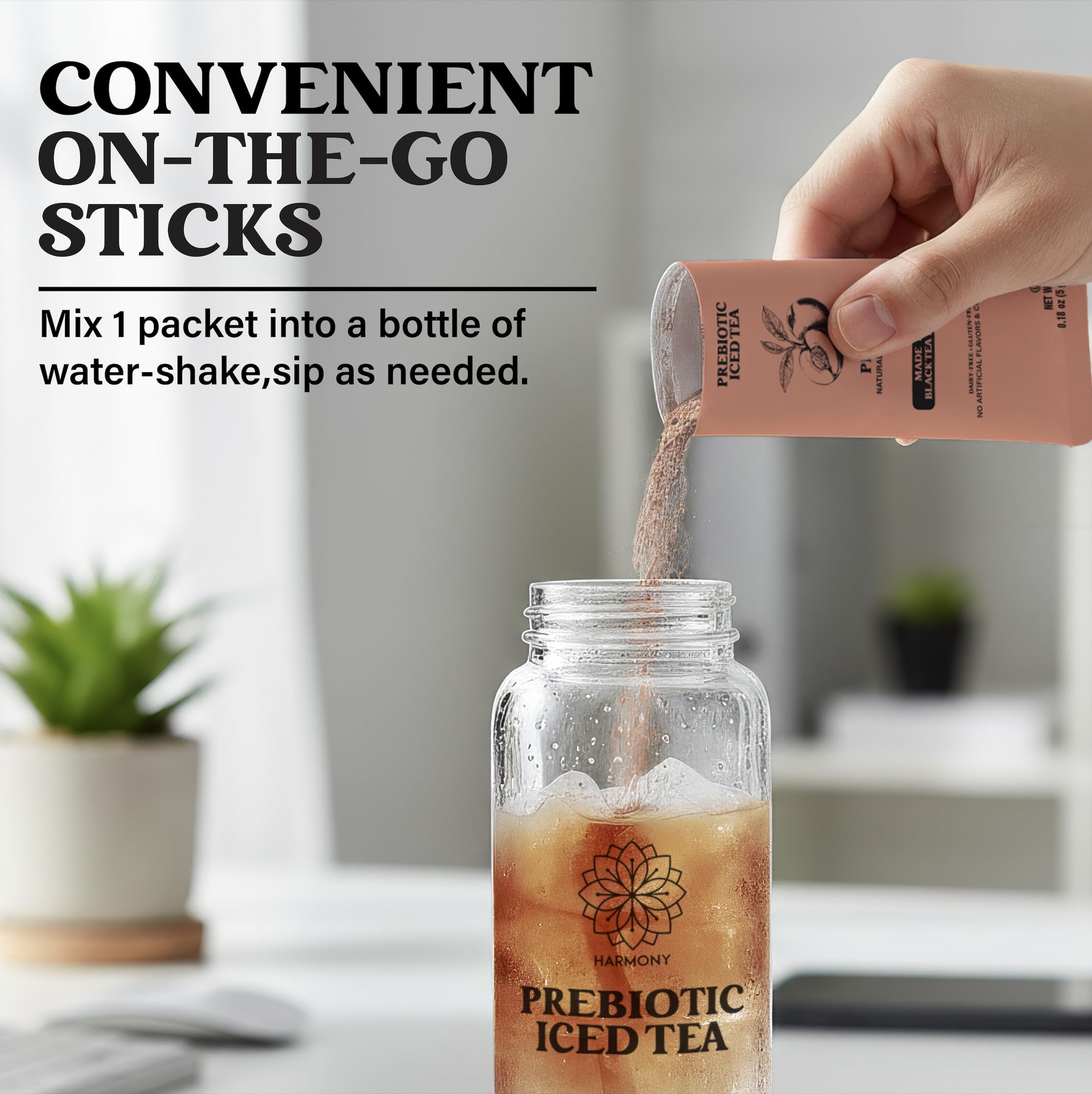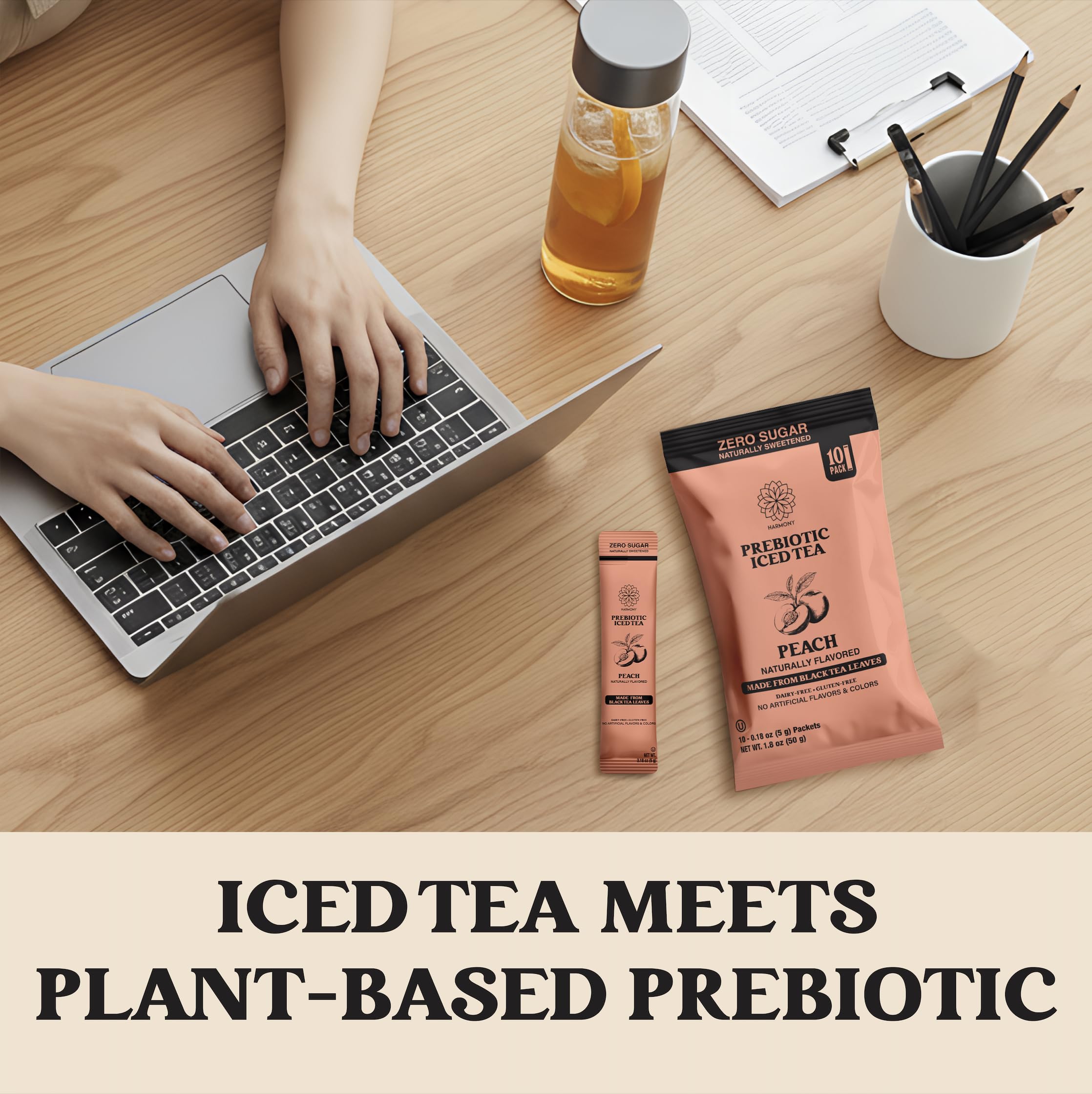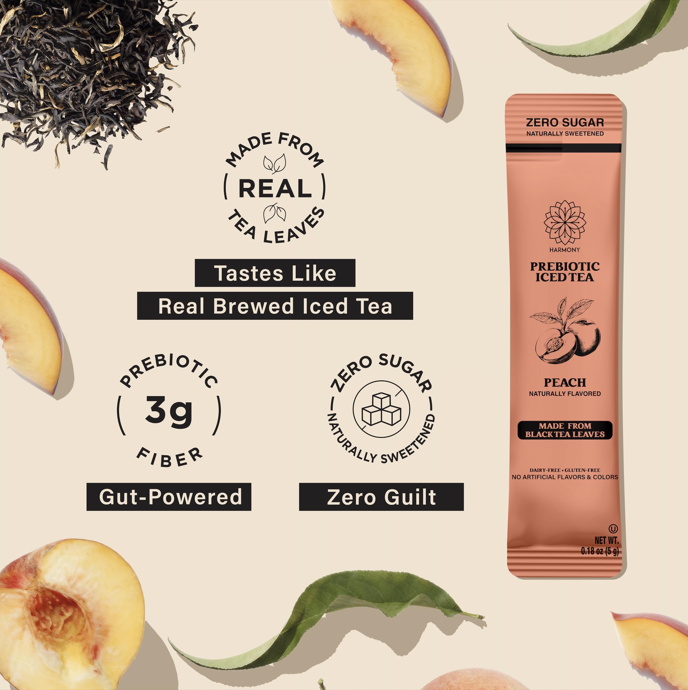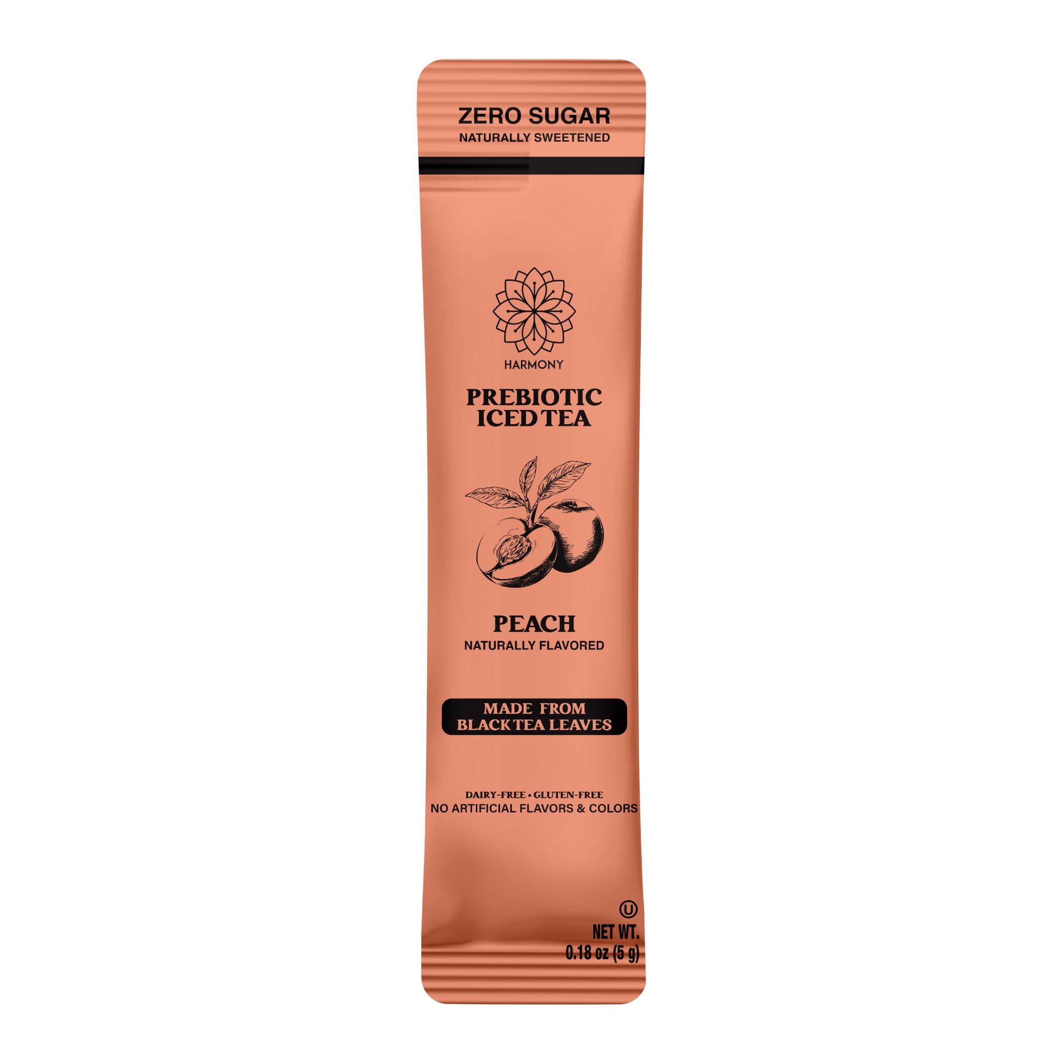 Harmony Matcha Prebiotic Black Tea Peach Flavor Iced Tea Drink Mix brings together authentic black tea taste with digestive wellness support. This convenient stick pack format dissolves instantly in cold water, delivering prebiotic plant fiber that nourishes your gut microbiome. Brewed from real tea leaves for naturally sourced caffeine and genuine peach flavor, each serving contains zero sugar and just 25 calories—no artificial sweeteners or fillers. Gluten free and clean label friendly, it's the perfect alternative to sugary sodas and bland health drinks. Whether you're at home, the office, or on the go, these 10 individually wrapped packs fit seamlessly into your daily routine. Experience bold, refreshing iced tea that actually supports your body's wellness goals.