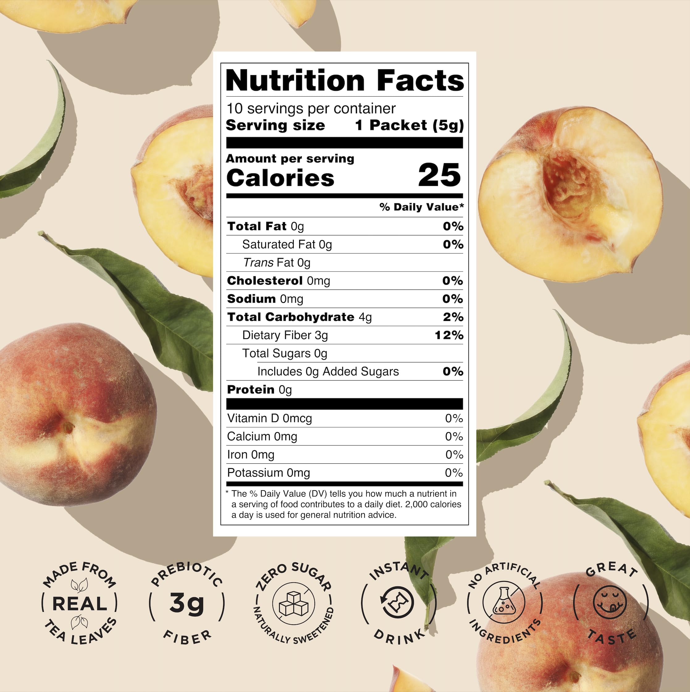 Prebiotic Black Tea Peach Flavor, Zero Sugar, 25 Calories per Stick Pack, 10 Count