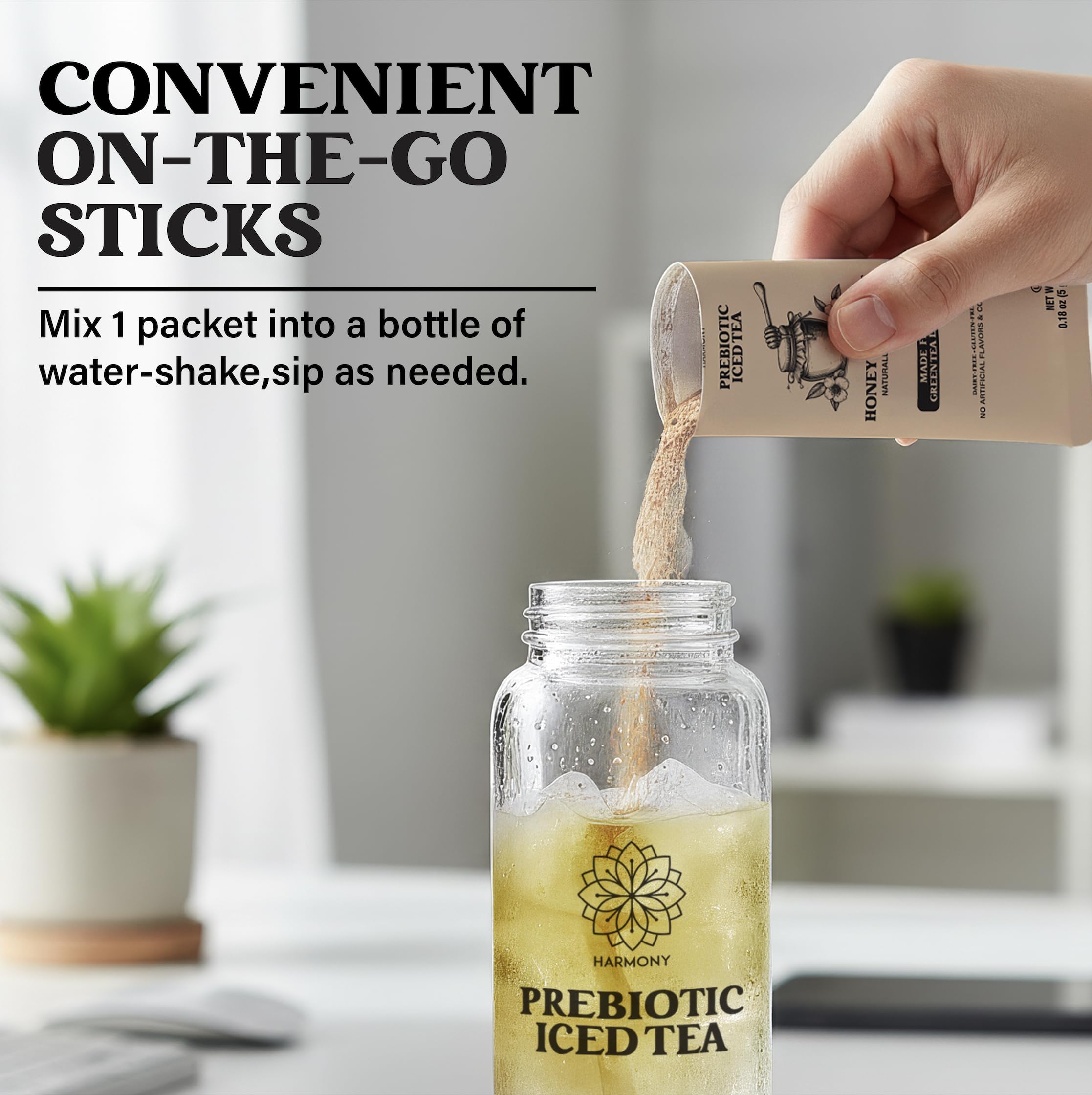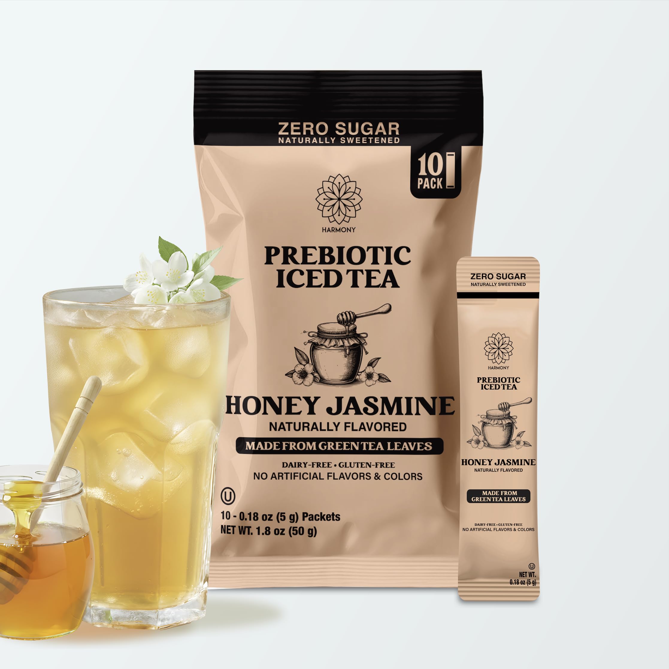 Discover the perfect blend of wellness and flavor with Harmony Matcha Prebiotic Green Tea Honey Jasmine. Each box delivers 10 convenient stick packs that dissolve instantly in cold water, making daily gut health support effortless.