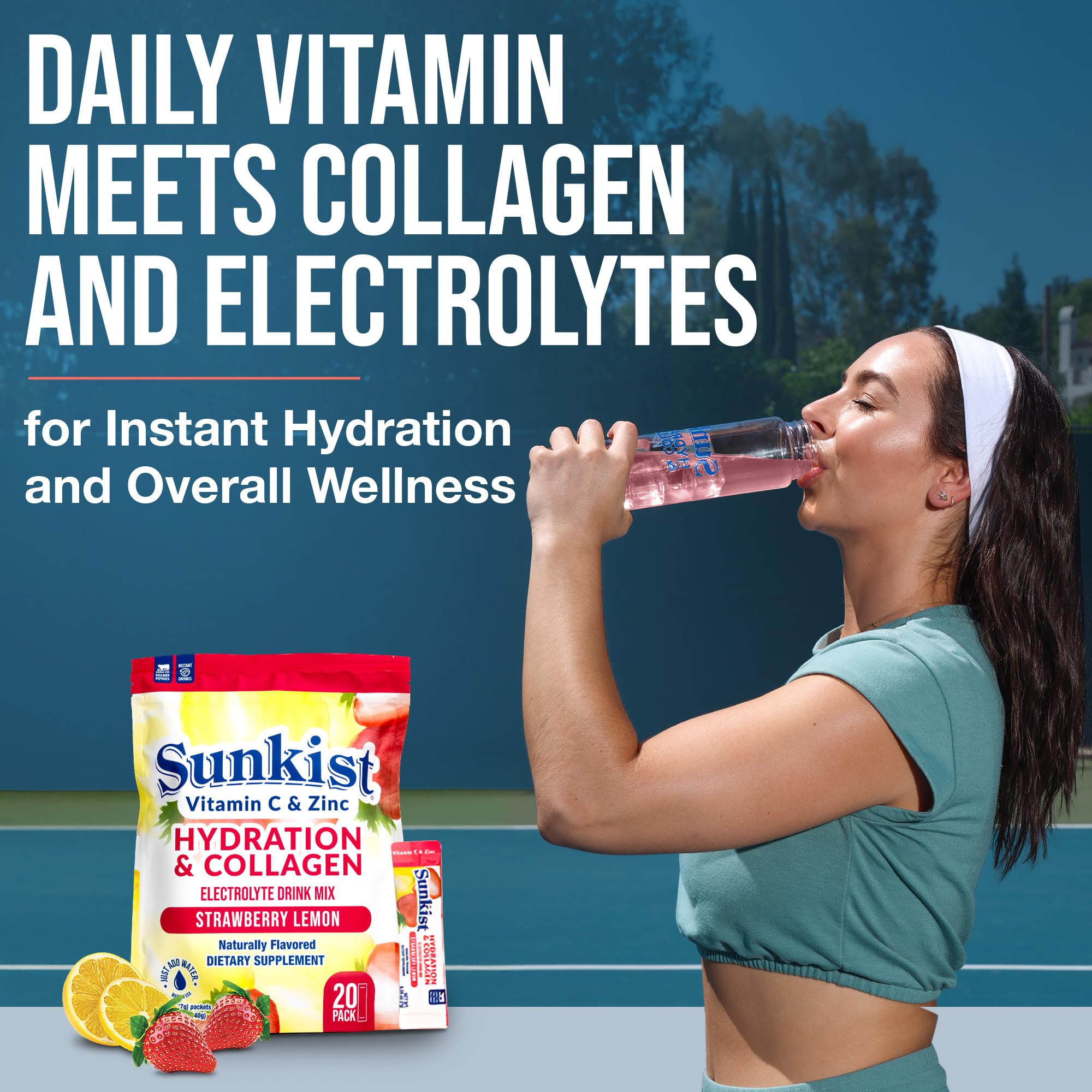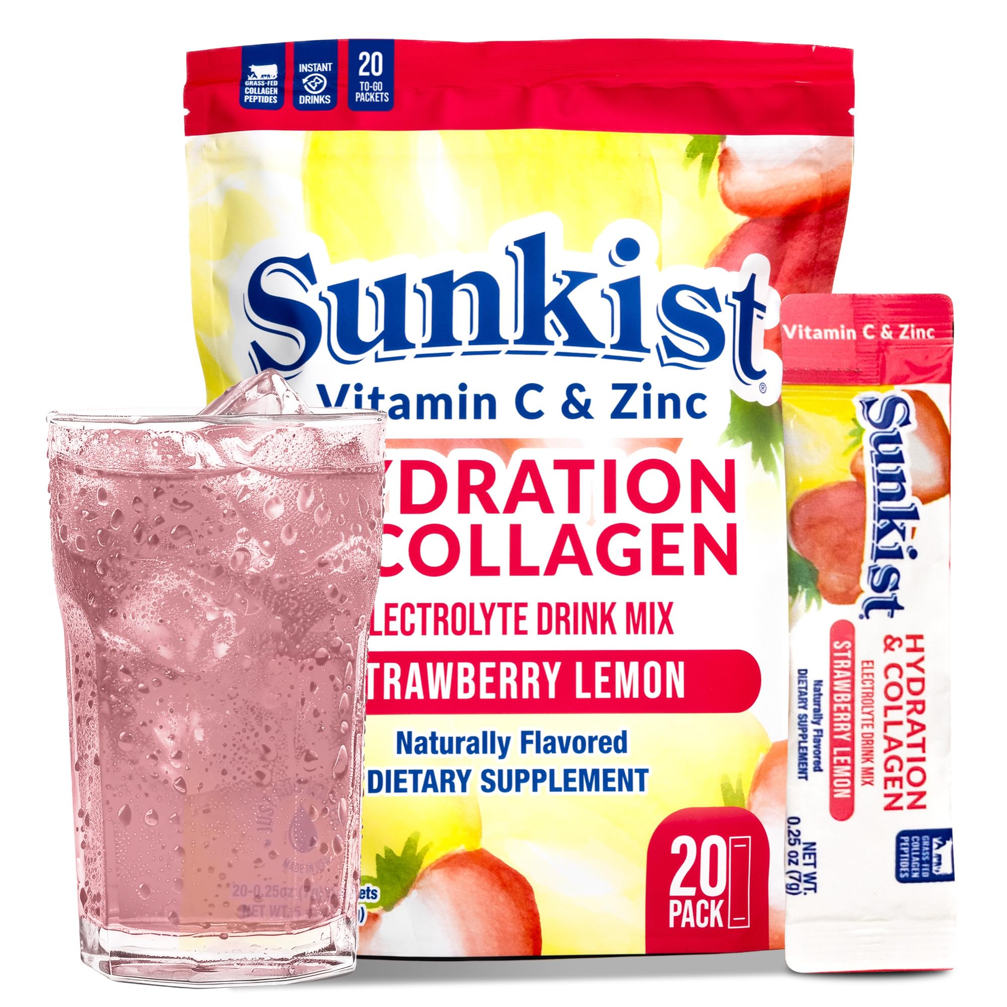 Sunkist Collagen + Hydration Drink Mix Powder Sunkist's Collagen + Hydration Powder combines the sweet flavors of strawberries and the tangy zest of lemons with the amazing health benefits of collagen and electrolytes. Contains essential vitamin C, zinc, and bovine collagen, ensuring you get a delicious and nutritious drink.