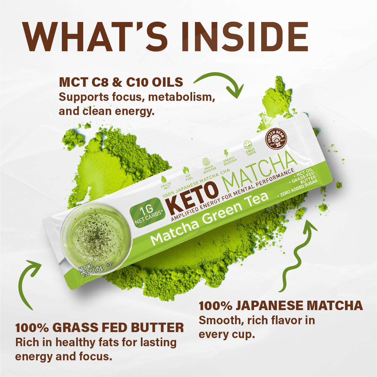 The Frozen Bean – Keto Matcha Green Tea Powder Drink Mix with MCT Oils, Zero Sugar, Boost Energy & Focus, Burn Fat & Support Metabolism, Antioxidant Superfood for Weight Loss, 20 Single Serve Sticks