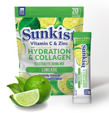 Sunkist Collagen + Hydration Drink Mix Powder Sunkist's Collagen + Hydration Powder combines the sweet flavor of fresh Yuzu with the amazing health benefits of collagen and electrolytes. Contains essential vitamin C, zinc, and bovine collagen, ensuring you get a delicious and nutritious drink. The sweet limeade aroma adds an extra sensory delight to this fine powder, which starts as yuzu and transforms into a cloudy yuzu beverage when mixed with water.