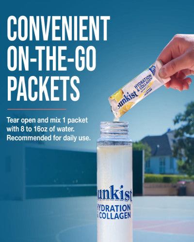 Sunkist Collagen + Hydration Drink Mix Powder Sunkist's Collagen + Hydration Powder combines the sweet flavor of fresh oranges with the amazing health benefits of collagen and electrolytes. Contains essential vitamin C, zinc, and bovine collagen, ensuring you get a delicious and nutritious drink. The sweet orange aroma adds an extra sensory delight to this fine powder, which starts as a pale orange and transforms into a cloudy orange beverage when mixed with water.